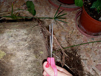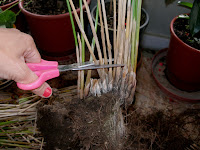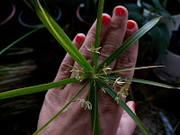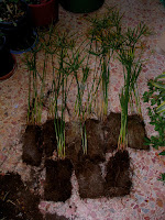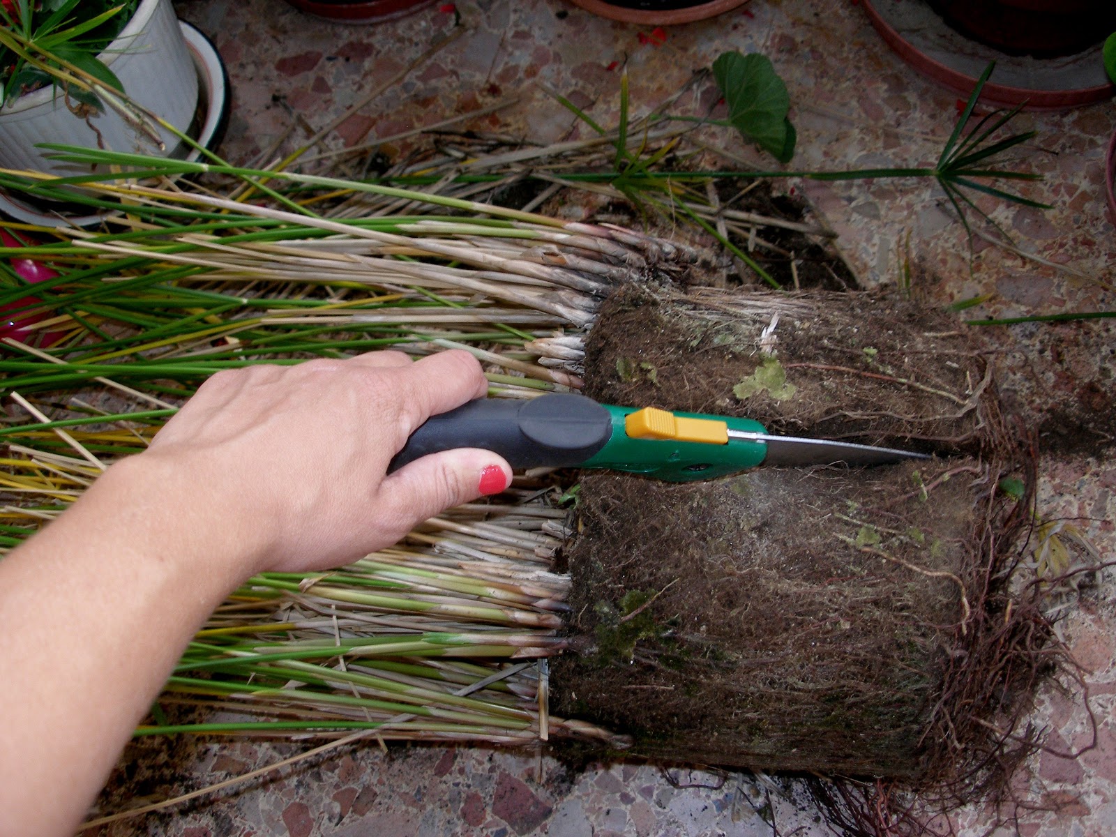 - Στο κάθε κομμάτι που θα αποσπάται από το αρχικό σώμα της μπάλας του φυτού (απαπα, τι επιστημονικό κείμενο) κόψε τα ξερά κλαδάκια του φυτού. Δε χρησιμεύουν σε τίποτε, απλά στέκονται όρθια σα τηλεγραφύξυλα. Και επειδή σε συμπάθησα, θα σου πω και το άλλο: βλέπεις αυτά τα σαν μίνι στάχια που έχει πάνω του το κάθε κλαδί του πάπυρου; Είναι τα λουλουδάκια του που αν τα μαζέψεις αφού ξεραθούν έχεις σπόρο πάπυρου. Φυτρώνει εύκολα και μπορείς να φτιάξεις τον δικό σου παπυρώνα και να έχεις παραγωγή, για να κορνιζάρεις το πτυχίο σου ή για άλλες πιθανές καθημερινές χρήσεις.
