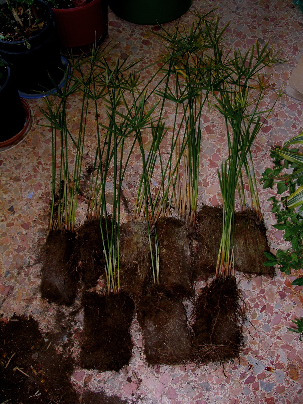 - Και κάπου εδώ φτάνουμε στο τέλος της σημερινής μας εκπομπής. Έχεις κόψει σε όσο μεγάλα θες εσύ κομμάτια τη μπάλα του πάπυρου και τα βάζεις το ένα δίπλα στο άλλο και τα καμαρώνεις. Μη κοιτάς σα χαζός. Πάρε γλαστράκια και φύτεψέ τα γρήγορα. Έτοιμα τα νέα παπυράκια σου. Ρίξε πολύ νερό. Πολύ λέμε.
