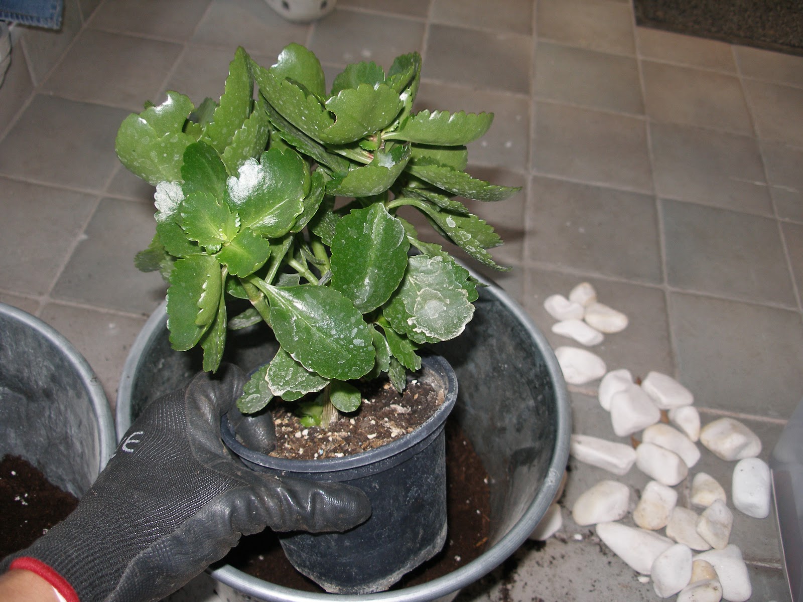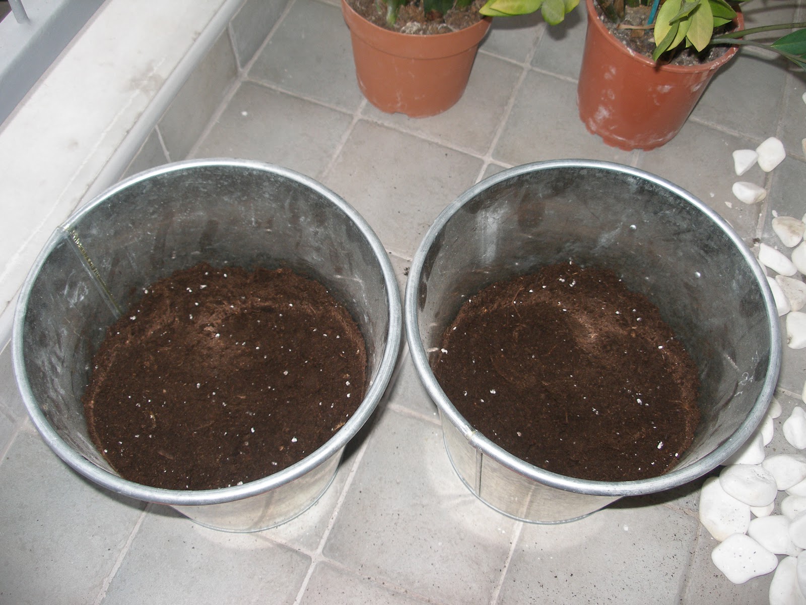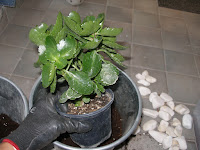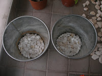Αν έχεις γλάστρες μπορείς και να μη ρίξεις βοτσαλάκια. Αν έχεις κασπώ θα ρίξεις σίγουρα, για να φεύγουν τα νερά από το χώμα σου. Ρίξε και το χώμα σου. Δε θέλει κάποιο ιδιαίτερο χώμα. Πρώτα βοτσαλάκια, από πάνω χώμα.