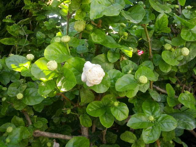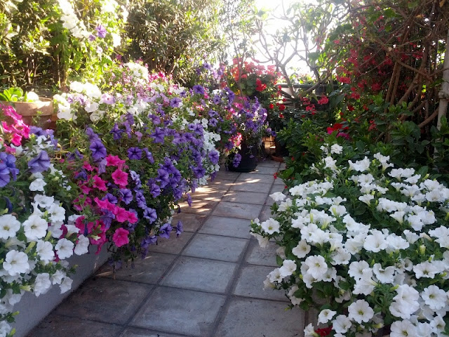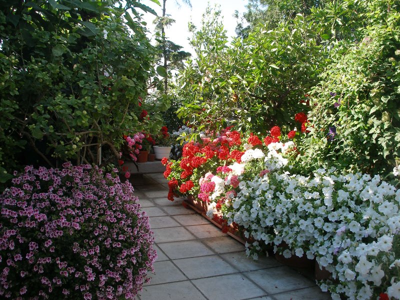 Είχα μετρήσει 44 διαφορετικά είδη στον ταρατσόκηπο αυτό! Ανάμεσά τους δέντρα, θάμνοι, κωνοφόρα, εσπεριδοειδή, κάκτοι και παχύφυτα, αναρριχώμενα, αρωματικά και λαχανικά. Και φυσικά άπειρες πόες. Ελιές, πικροδάφνη, βατομουριές, πλουμέριες, μπρουγκμάνσιες, βιγόνιες, μολόχες όοοοοολων των ειδών, κέρρια, κληματσίδες κτλ.