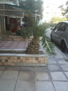 Τις φωτογραφίες τράβηξε και έστειλε με περισσή χαρά η δυο φορές τυχερή σε ΚηποΔιαγωνισμό αναγνώστρια Nastazia, γιατί λέει της έκαναν εντύπωση. Είναι, λέει, αυτός ο φοίνικας μέσα σε αυτό το παρτέρι. Εντάξει, του έρχεται λίγο εφαρμοστό. Πρόσεξε όμως και μία ακόμη λεπτομέρεια: το παρτέρι δεν είναι χτισμένο και το χώμα δεν φτάνει βαθιά στη γη. Αλλά; Τι; Τυρί και ψωμί. Έτσι όπως ήταν το πεζοδρόμιο πήγε ο μάστορας και “έχτισε” ένα παρτέρι τοποθετώντας τουβλάκια το ένα πάνω στο άλλο. Και το γεμισε με χώμα. Απλό και κατανοητό. Πήγε και ακούμπησε ένα παρτέρι πάνω στις πλάκες του πεζοδρομίου. Γιατί όχι;