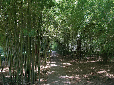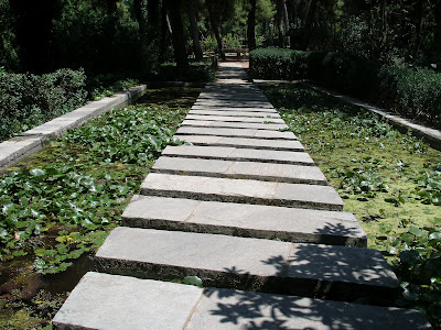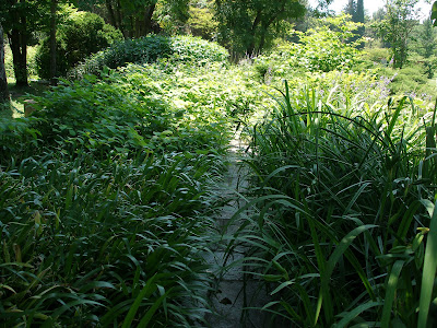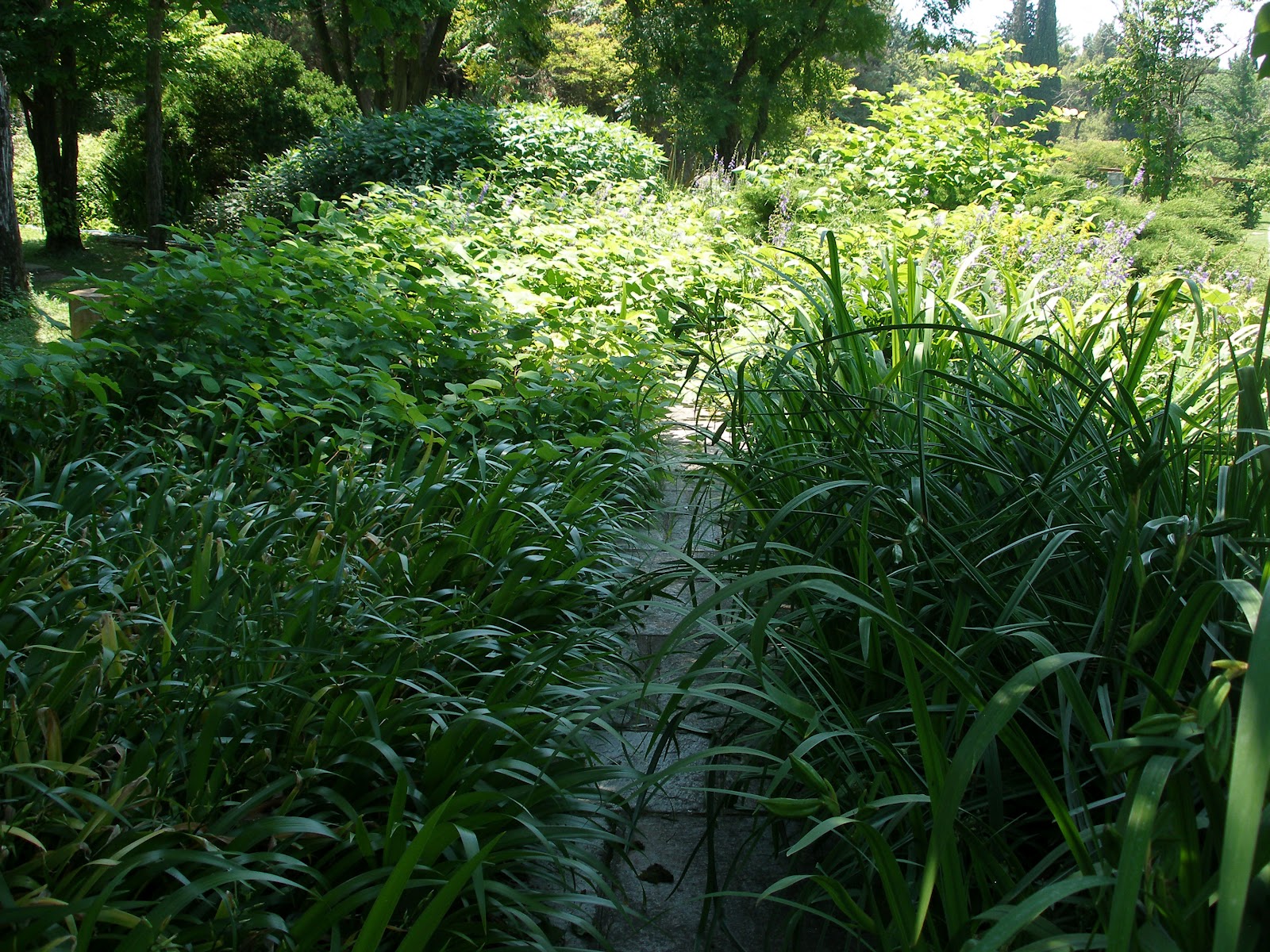 Πιο περα περνάς από τον κήπο με τα υδροχαρή φυτά. Δηλαδή; Δηλαδή νούφαρα, πάπυροι, μπαμπουδάκια. Και προσέχεις πού πατάς γιατί έχει παντού νερά. Νερά παντού. Και είναι καλυμμένα με ένα πράσινο πράμα φυτικό, δε ξέρω τι είναι. Λυπάμαι. Το οποίο σου δίνει την εντύπωση ότι είναι γρασίδι, αλλά δεν είναι. Και αν πας να περπατήσεις εκεί πάνω, θα πέσεις μέσα στο νερό.