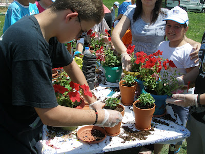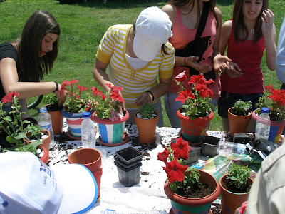 Και καταπιάστηκαν αμέσως με τα γλαστράκια τους και τα φυτέματα. Το κάθε παιδί είχε από δύο γλαστράκια. Στο ένα φύτεψε σγουρό βασιλικό και στο άλλο μία κατακόκκινη πετούνια.