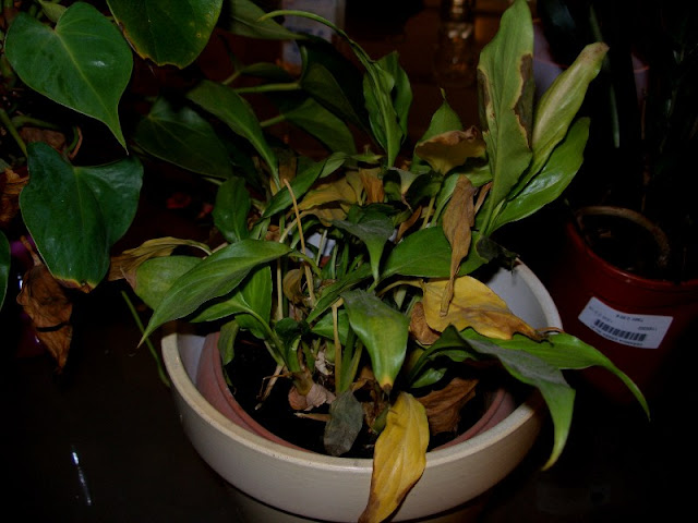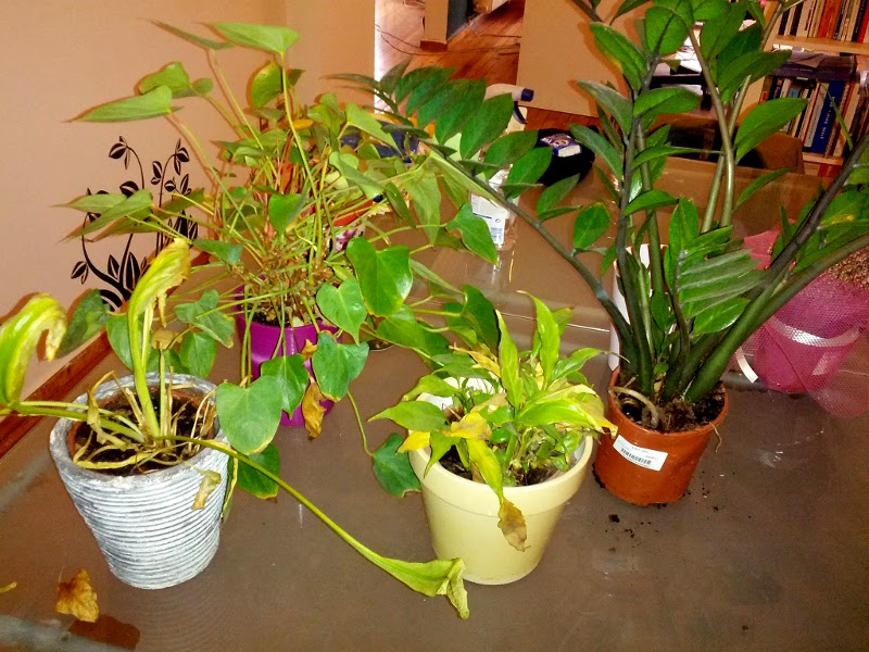 Αρκεί να τα γιατροπορέψεις και να τα ταχταρίσεις και θα έρθουν στα συγκαλά τους. Κοίτα για παράδειγμα τα δόλια φυτά της παρακάτω φωτογραφίας: δεν είναι καν μεταφυτεμένα, βρίσκονται απλά τοποθετημένα μέσα σε κασπό, ποτίζονται στη χάση και στη φέξη και είναι τίγκα στα κίτρινα και στα ξερά φύλλα.