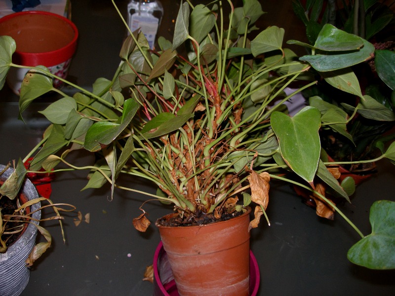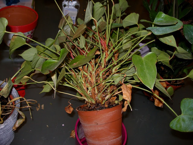 Τη σημερινή τριλογία ταλαίπωρων φυτών κλείνει αυτό το ανθούριο. Αλήθεια είναι ότι δεν είναι σε άσχημη κατάσταση, αλλά τουναντίον (ποιανού; Του ναντίον.) στη μικρή γλάστρα που ήταν ξεχασμένο έβγαζε συνέχεια φρέσκα φυλλαράκια. Για να συνεχίσει, λοιπόν, να βγάζει φυλλαράκια και να κάνει μία λαμπρή καριέρα στο χώρο της κηπουρικής, θα το μεταφυτεύσουμε σε μία μεγαλύτερη γλάστρα με χώμα.