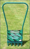 Εξαερωτήρας χειροκίνητος στατικός. Αυτός είναι ένας χειροκίνητος, ή καλύτερα ποδοκίνητος εξαερωτήρας. Τον πατάς με δύναμη (όπως και το πατόφτυαρο) για να μπει στο έδαφος και τον τραβάς να βγει. Βγαίνοντας, θα δεις ότι έχει φτιάξει μικρά μικρά κυλινδρικά χωμάτινα πραματάκια και τρύπες στο έδαφος, ίσης διαμέτρου με τα μικρά κυλινρικά πραματάκια, σαν καρότα. Κατάλληλο για μικρές επιφάνειες γκαζόν.