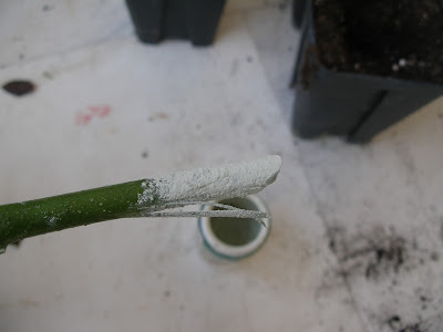 Βρέξε λίγο την άκρη του κλαδιού και βούτα την σε ορμόνη ριζοβολίας. Πλιτς. Τίναξε την περίσσεια σκόνη που κόλλησε στο κλαδί.