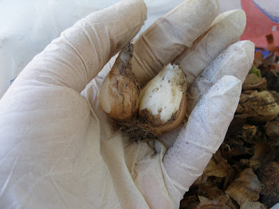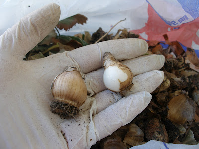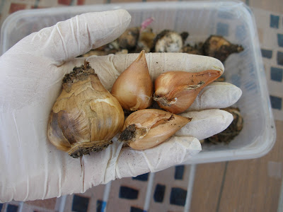 Θα παρατηρήσεις και ότι οι περισσότεροι έχουν και ένα μικρό βολβουδάκι δίπλα τους. Θυμάσαι που σου είχα πει ότι οι βολβοί έτσι πολλαπλασιάζονται: φτιάχνοντας όσο είναι φυτεμένοι και μεγαλώνουν κι άλλα βολβουδάκια πλάι τους, αγκαλίτσα τους.