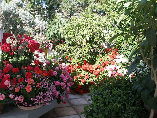 Είχα μετρήσει 44 διαφορετικά είδη στον ταρατσόκηπο αυτό! Ανάμεσά τους δέντρα, θάμνοι, κωνοφόρα, εσπεριδοειδή, κάκτοι και παχύφυτα, αναρριχώμενα, αρωματικά και λαχανικά. Και φυσικά άπειρες πόες. Ελιές, πικροδάφνη, βατομουριές, πλουμέριες, μπρουγκμάνσιες, βιγόνιες, μολόχες όοοοοολων των ειδών, κέρρια, κληματσίδες κτλ.