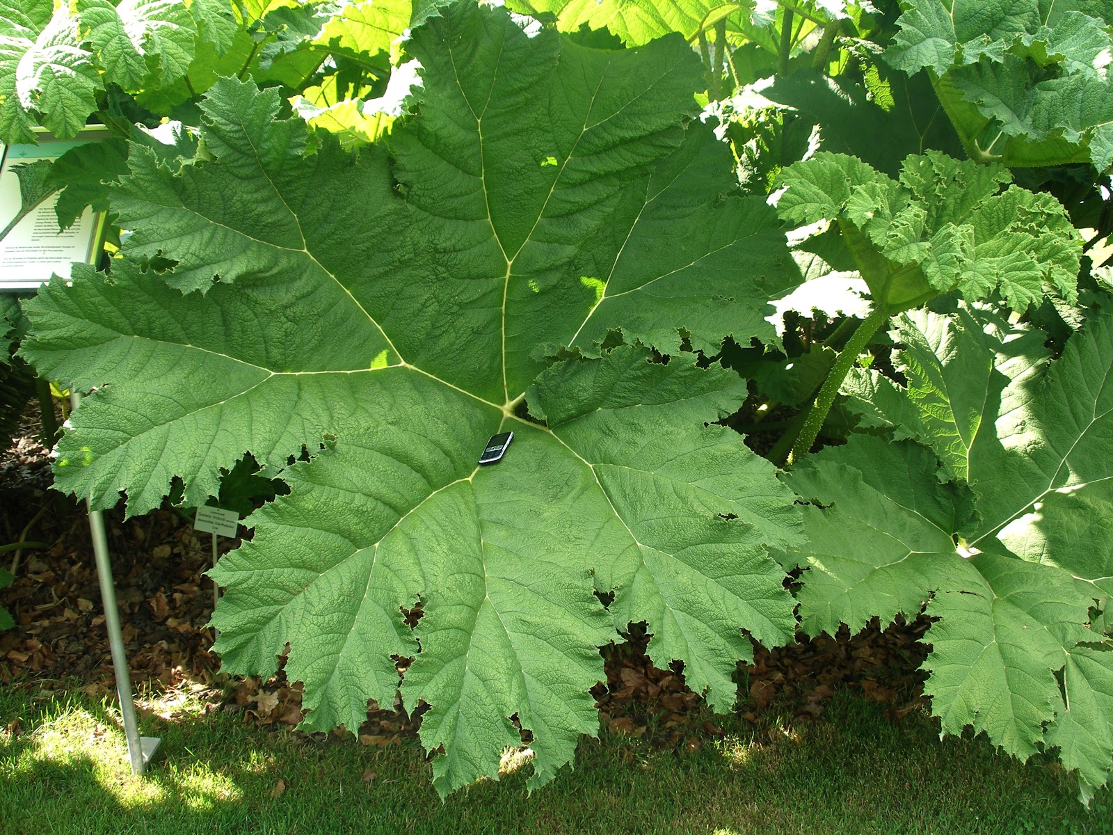 | Στην αγκαλιά του φύλλου κούρνιασε – σχεδόν εξαφανίστηκε – το παπιόφωνο. Όχι άδικα, στα γερμανικά το φυτό το λένε Mammutblatt, δηλαδή “Φύλλο μαμούθ”! |