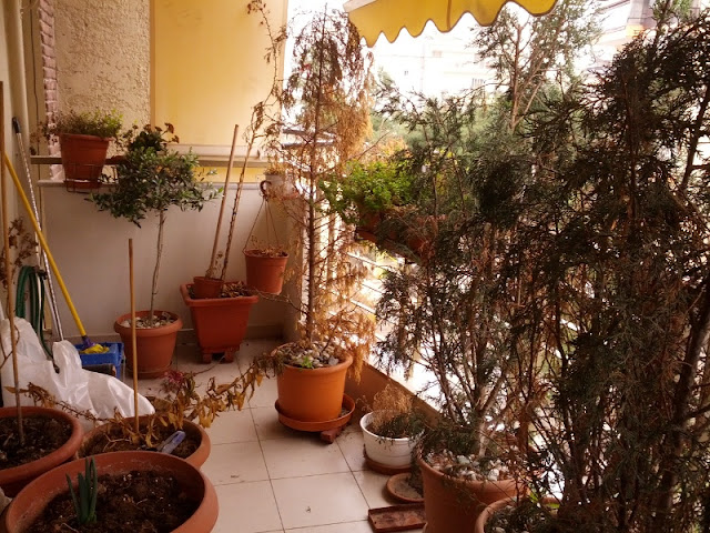 Αυτή την εντολή δέχτηκε πριν από λίγο καιρό η παπίτσα: “Έλα, παπίτσα, να μας τακτοποιήσεις το μπαλκόνι, γιατί έχει τα χάλια του και δε μας κάνει κέφι πια να καθόμαστε έξω”. Πάρε και εσύ μερικές ιδέες πώς μπορείς να γεμίσεις με πλούσια και ντελικάτη πρασινάδα ένα μετρίου μεγέθους μπαλκόνι χωρίς να το μπουκώσεις και να το κάνεις δυσβάσταχτο και ψυχοπλακωτικό. Ρίξε μία ματιά πώς ήταν το μπαλκόνι όταν έπεσε στα χέρια και στα σκαλιστήρια της παπίτσας. Ήταν έτσι.
