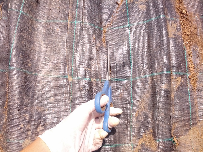 Θα χρειαστείς ένα ψαλίδι και ένα κομμάτι γεωύφασμα. Α, και έναν λαχανόκηπο. Αρχικά, στρώνεις το γεωύφασμα σε όλη την επιφάνεια και κόβεις μικρά τετράγωνα περίπου 20Χ20εκ. Προσοχή, δεν κόβεις και τις τέσσερις πλευρές. Αφήνεις τη μία πλευρά άκοπη και το κόβεις σαν παραθυράκι. Αυτό το κάνεις επειδή δε θέλεις να καταστρέψεις το γεωύφασμα τελείως γιατί μπορεί να το χρειαστείς κάπου αλλού την επόμενη φορά και δε θέλεις να είναι γεμάτο τετράγωνες τρύπες. Και αφού το κόψεις, δίπλωσέ το προς τη μέσα πλευρά. Να, δες.