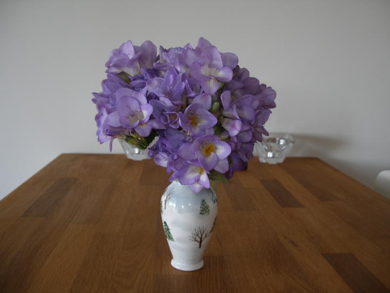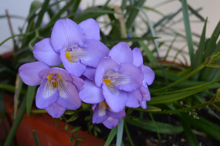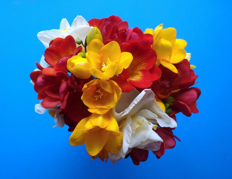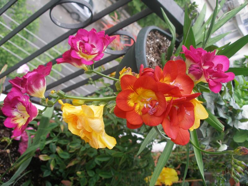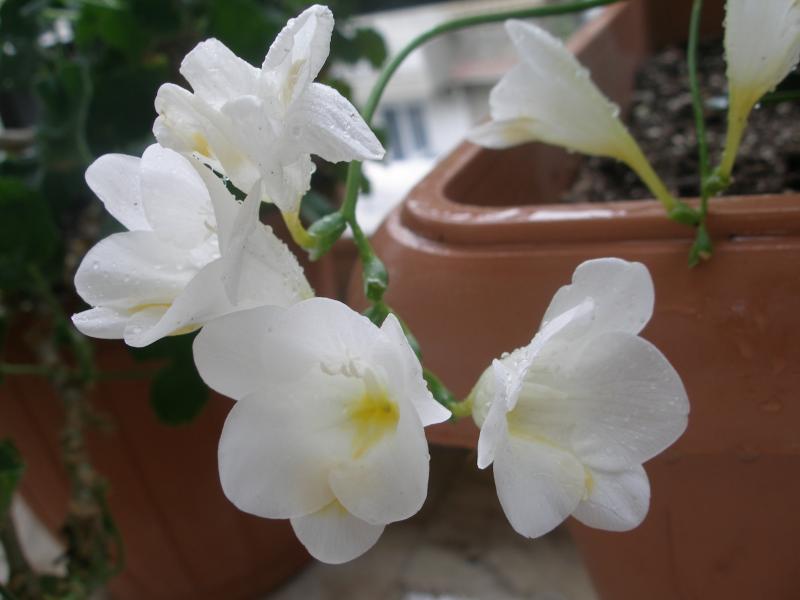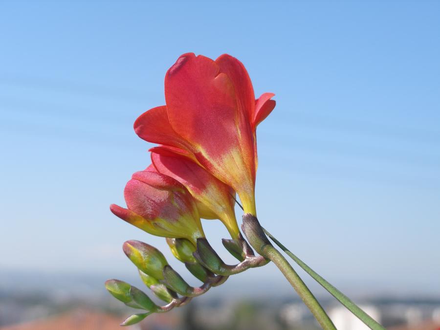 Οι φρέζιες τόσο καιρό, από τότε που τις φυτέψαμε, μεγάλωναν και έφτασαν τέτοια εποχή να ανθίσουν. Το καλό με δαύτες είναι ότι πάνω στον κάθε ένα ανθοφόρο βλαστό έχουν πολλά μπουμπούκια το ένα δίπλα στο άλλο στη σειρά. Και ανοίγουν το ένα μετά το άλλο. Δηλαδή, κρατάνε ανθισμένες πολλές μέρες. Να, δες αυτό το μαγικό με τα μπουμπουκιά το ένα δίπλα στο άλλο στην παρακάτω κατατοπιστική φωτογραφία μπροστά στον καταγάλανο καθάριο ουρανό.